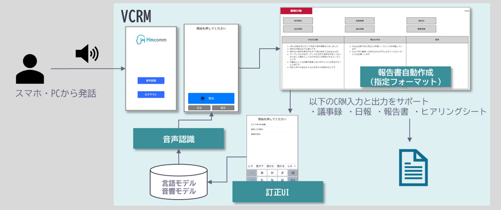 VCRMとはスマートフォンやPCから「声」での入力を行うだけで音声認識が行われ、